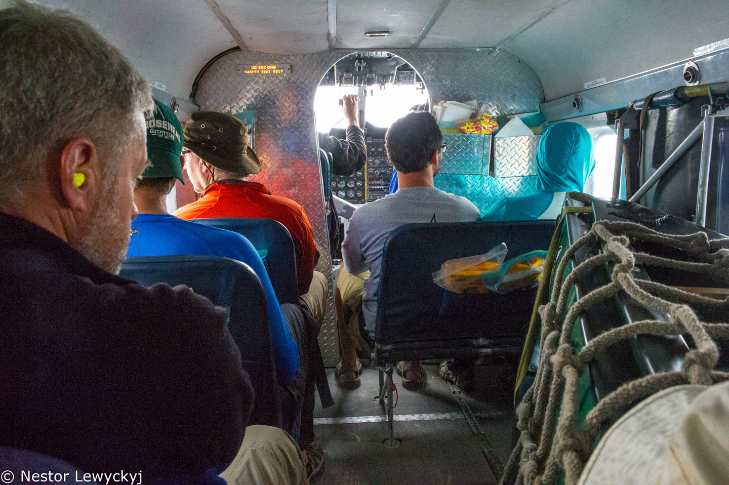 You can clearly see all of our gear and the 3 canoes on one side, and us on the other. It's only about an hour flight, perhaps a bit more, so its not too bad. Plus they fly at only a few thousand feet so you get great views of the terrain. Roman is holding a bag of ear plugs, always welcome on these flights!