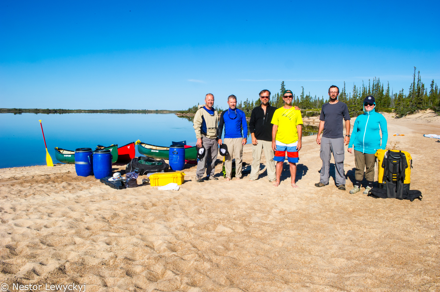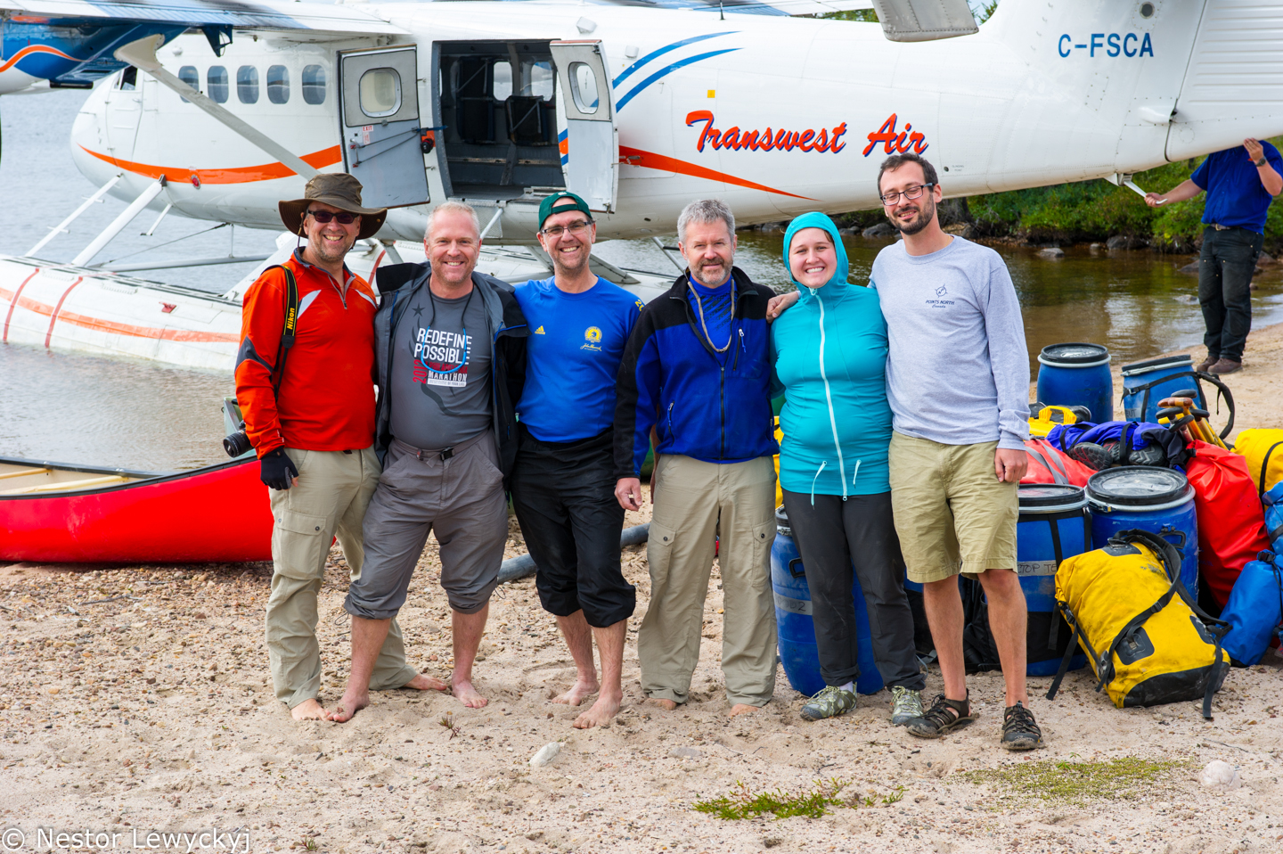 Bob graciously took this group shot of us before he set off back to Stony Rapids. He had flown us about 250 kilometres due north of Stony Rapids, landing on the very northern part of Damant Lake. We all helped out in the task of unloading the plane. It's not easy manoeuvring the canoes out of the Twin Otter. The start of the Elk River was only a few kilometres north of us at this point.