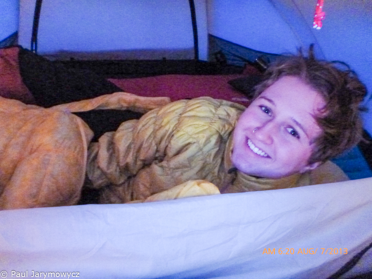 Any time, any place! Alex waiting for Paul to finish packing up their tent